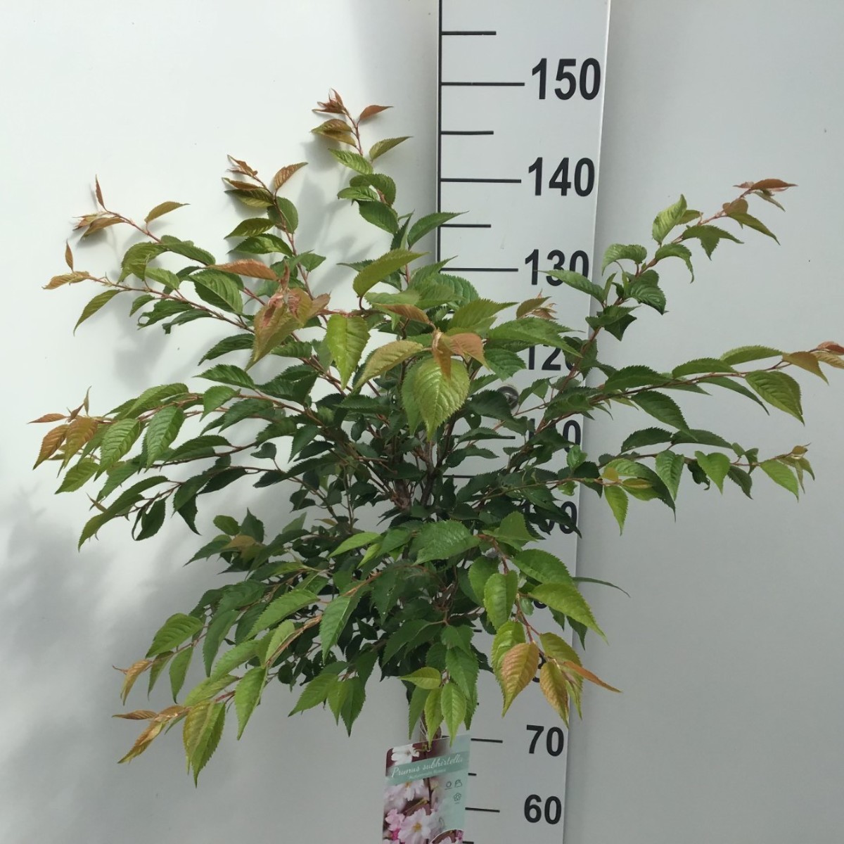 Mittelgroßer Baum mit einer breit ausladenden Krone. Höhe ca. 5-6 m. Grünes Blatt. Herbstfärbung gelb bis orange. Blütezeit: November bis April. Hellrosa, halbgefüllte Blüten in hängenden Trauben. Sonniger Standort. Fruchtbare Böden.