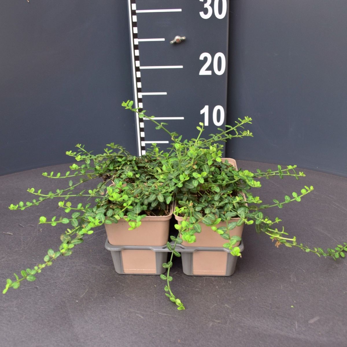 Niedrig wachsender, sehr kompakter, bodendeckender Strauch. Höhe bis 15 cm. immergrün. Lange Triebe manchmal emporrankend. Blatt klein und dunkelgrün. Im kalten Winter dunkelbraunrot verfärbend. Schattenverträglich.
