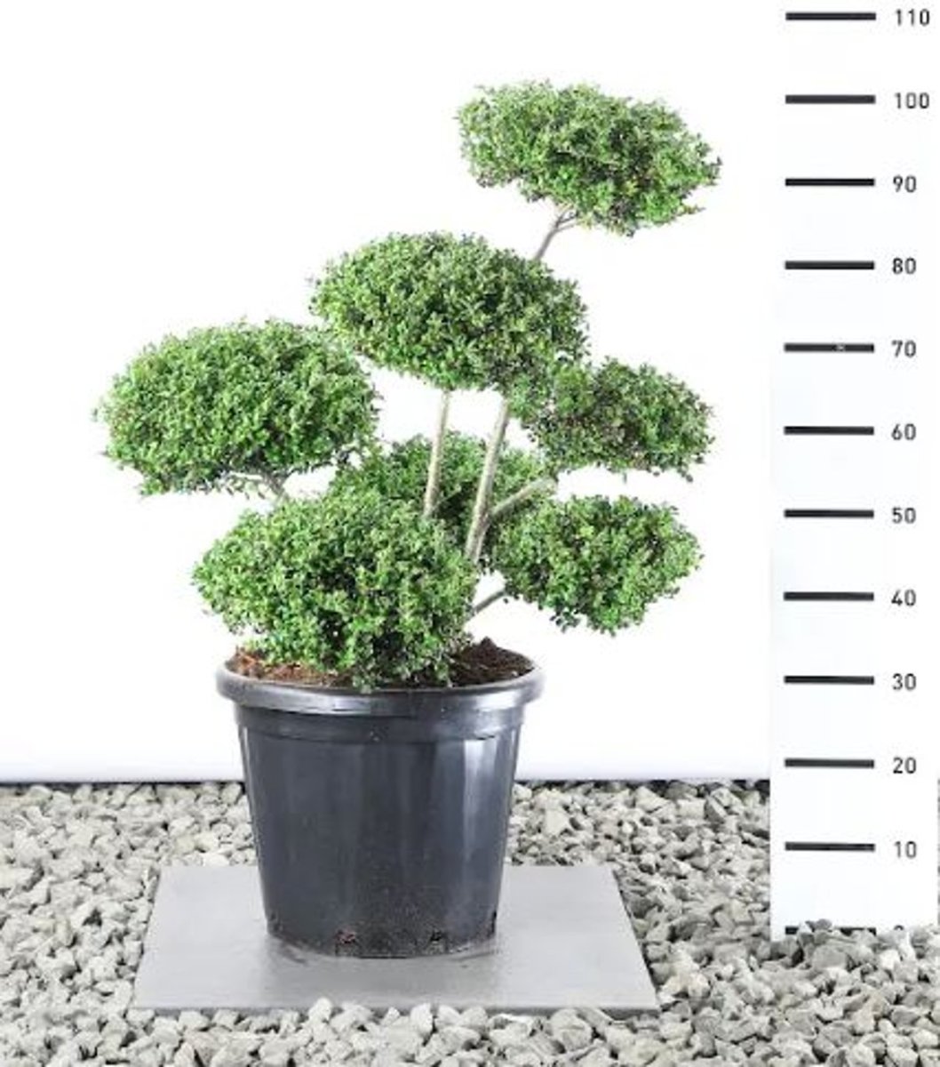 Langsam wachsender, kompakter Strauch. Immergrün. Höhe ca. 1 m. Besonders schnittverträglich. Kleines, glänzend frischgrünes Blatt. Unauffällige Blüte, kleine schwarze Beeren im Herbst. Sonne und Schatten. Nahrhafte Böden.
