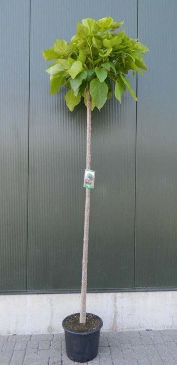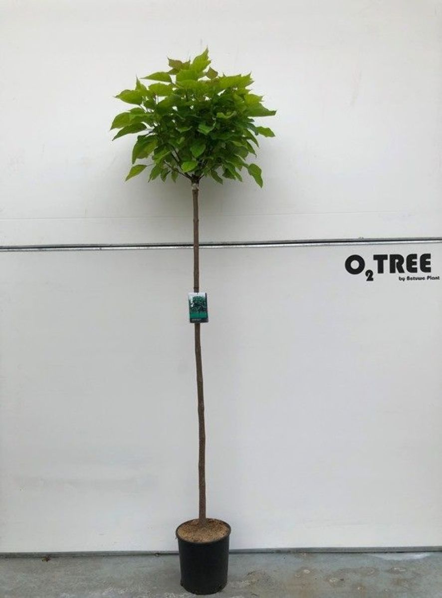 Breit auswachsender Baum mit einer flachen, kugelförmigen, dicht verzweigten Krone. Höhe 4-6 m. Großes, hellgrünes Blatt. Keine Blüten. Schnittverträglich. Besonders geeignet für kleine Gärten und Auffahrten. Bevorzugt einen vor Wind geschützten Standort.