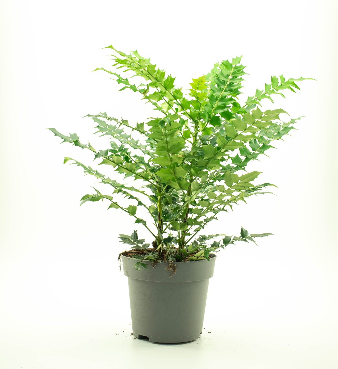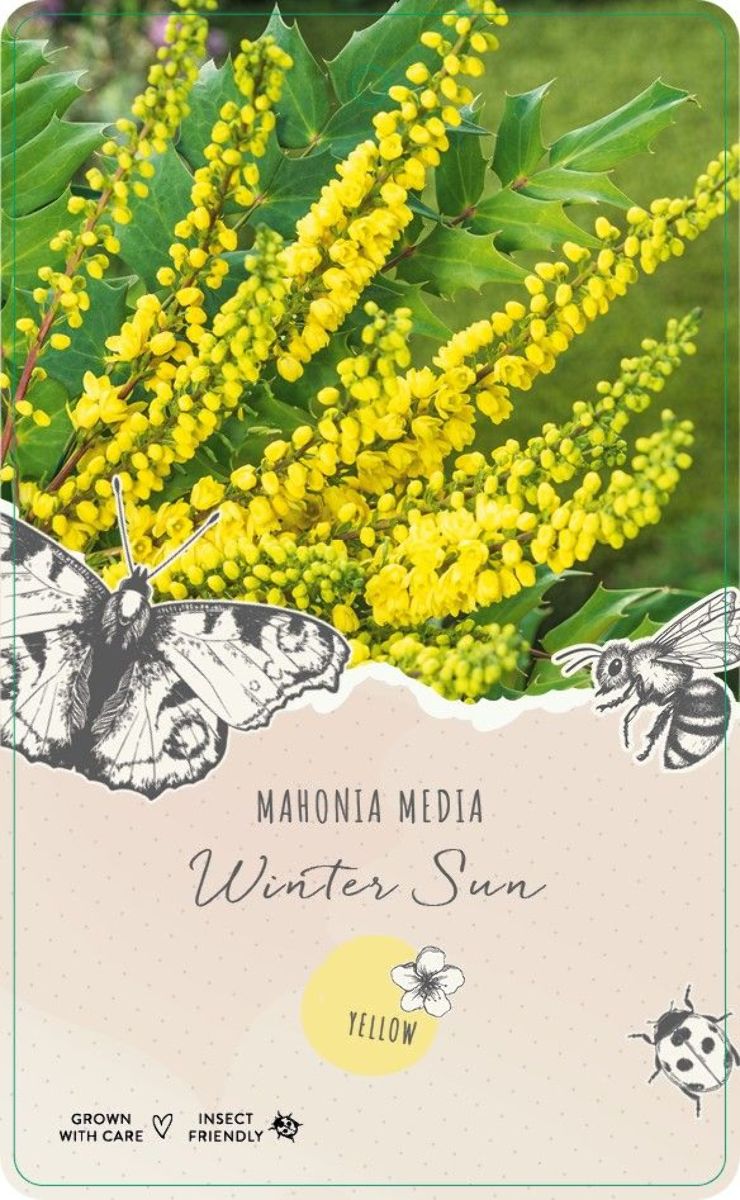 Immergrüner, aufrecht wachsender Strauch, bis ca. 1,5 m hoch werdend. Großes, mattgraugrünes Blatt. Blattunterseite hellgrün. Aufrecht stehende Trauben mit reingelben Blüten. Dezember-Februar. Blaue, bereifte Beeren im Spätsommer. Sonne-Halbschatten. Gedeiht auf allen Gartenböden.