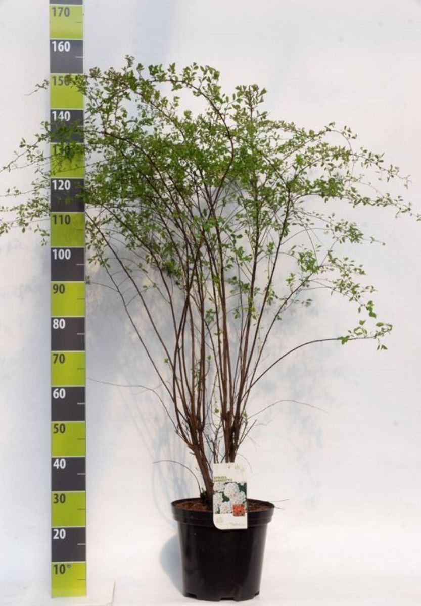 Strauch, bis 2 m hoch werdend. Überhängende Zweige. Breites, dunkelgrünes Blatt. sommergrün. Reinweiße Blüten in kleinen Schirmrispen. Reichblühend. Mai-Juni. Jedes Jahr einige alte Äste wegschneiden. Gedeiht auf allen Gartenböden. Sonne.