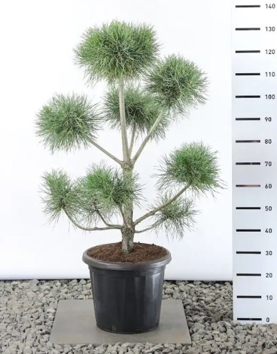 Ansehnlich hohe, aufrechte Konifere. Zunächst noch pyramidenförmig, später mit mehr oder weniger schirmförmiger und offener Krone. Höhe ca. 10 m. Nadeln lang und dunkelgrün, leicht gedreht. Hängende Zapfen. Geeignet für trockenen Boden.