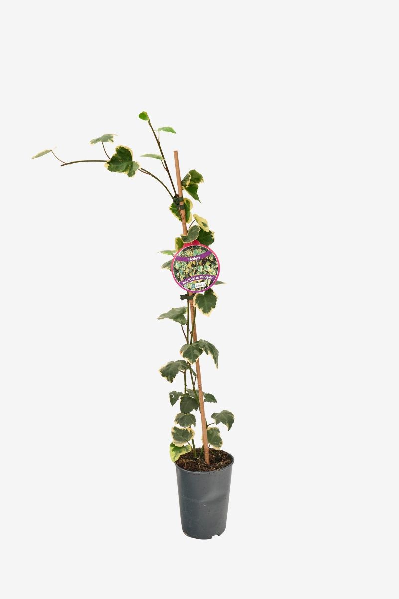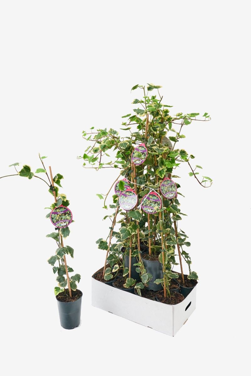 Immergrüne Kletterpflanze. Hält sich mit eigenen Haftwurzeln. Langsam wachsend. Großes, grünes Blatt mit einem unregelmäßigen, perlweißen Rand. Für Sonne und Schatten. Im Herbst gelbgrüne Blüten, danach schwarze Beeren.