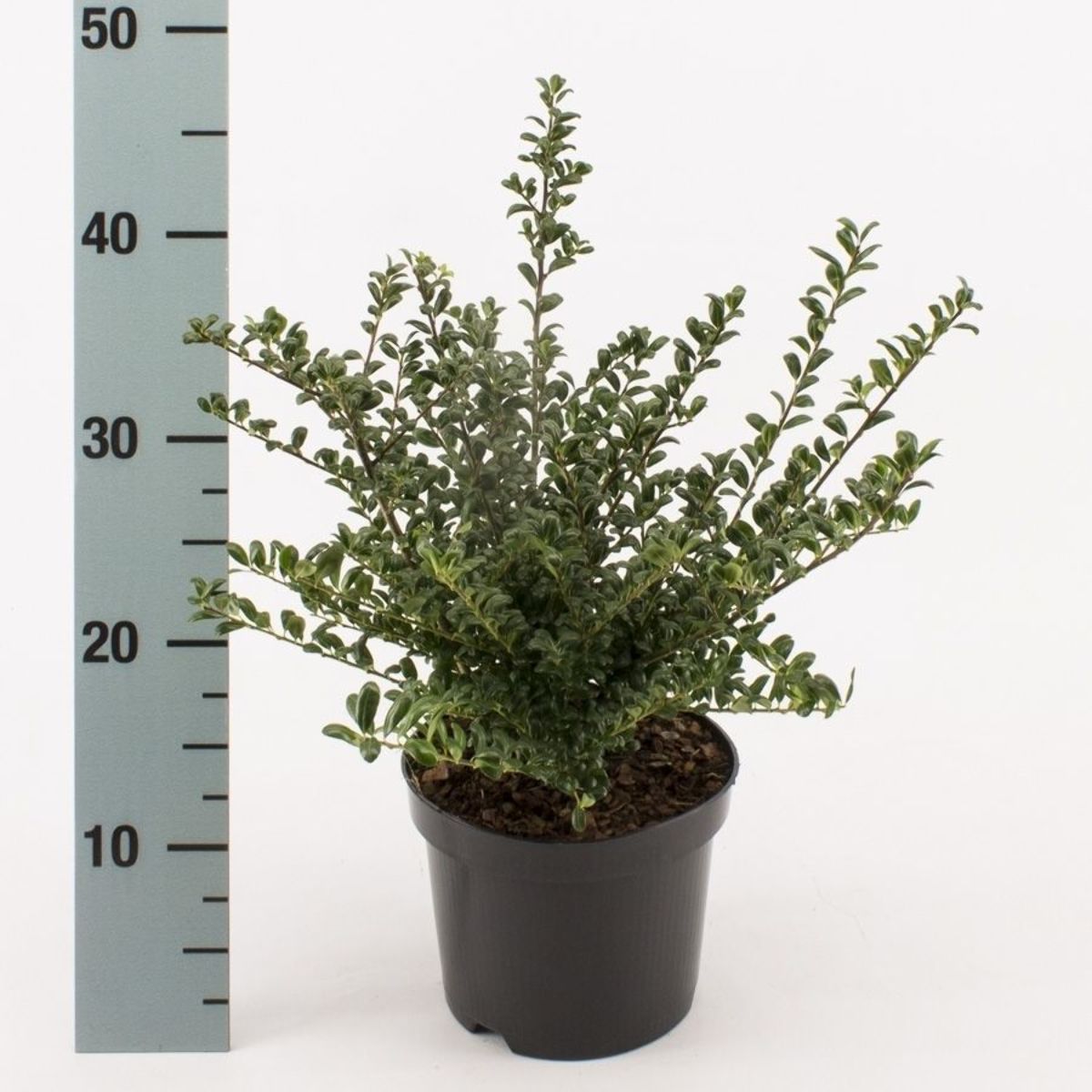 Langsam wachsender, kompakter Strauch. Immergrün. Höhe ca. 1 m. Besonders schnittverträglich. Kleines, glänzend frischgrünes Blatt. Unauffällige Blüte, kleine schwarze Beeren im Herbst. Sonne und Schatten. Nahrhafte Böden.