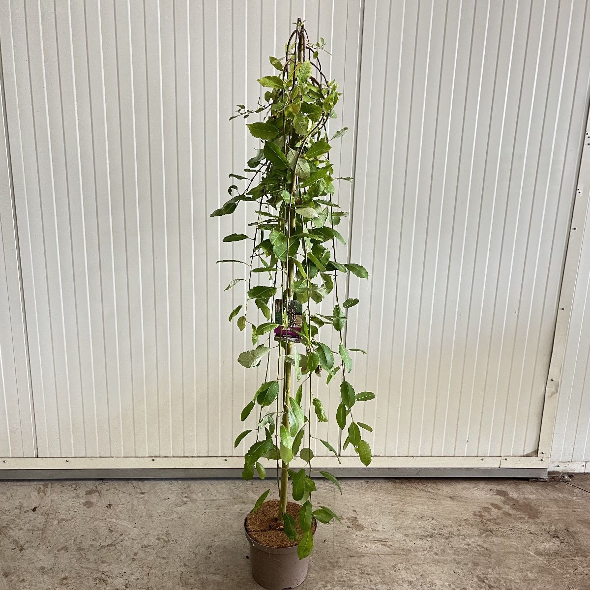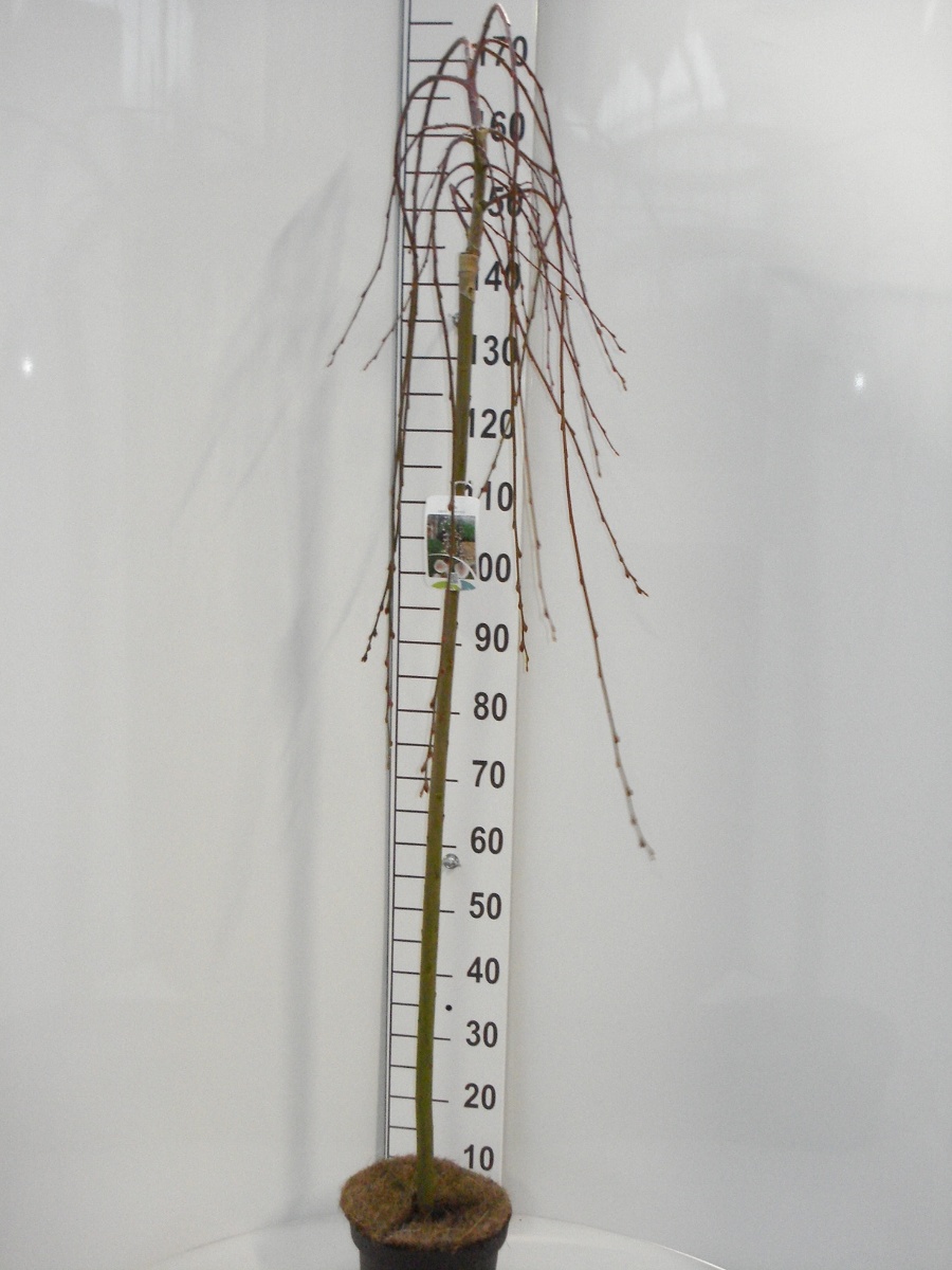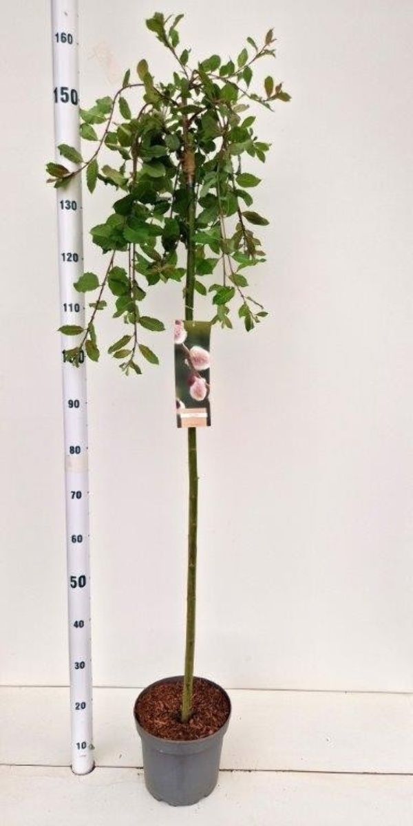 Trauerweide, wird oft auf Niederstamm gezüchtet. Breit auswachsend. Stark herabhängende Zweige. Höhe 1,5-2 m. sommergrün. Blatt mattgrün. Zahlreiche, große, silbrige Kätzchen im frühen Frühjahr. Nach der Blütezeit schneiden. Einzelbaum.