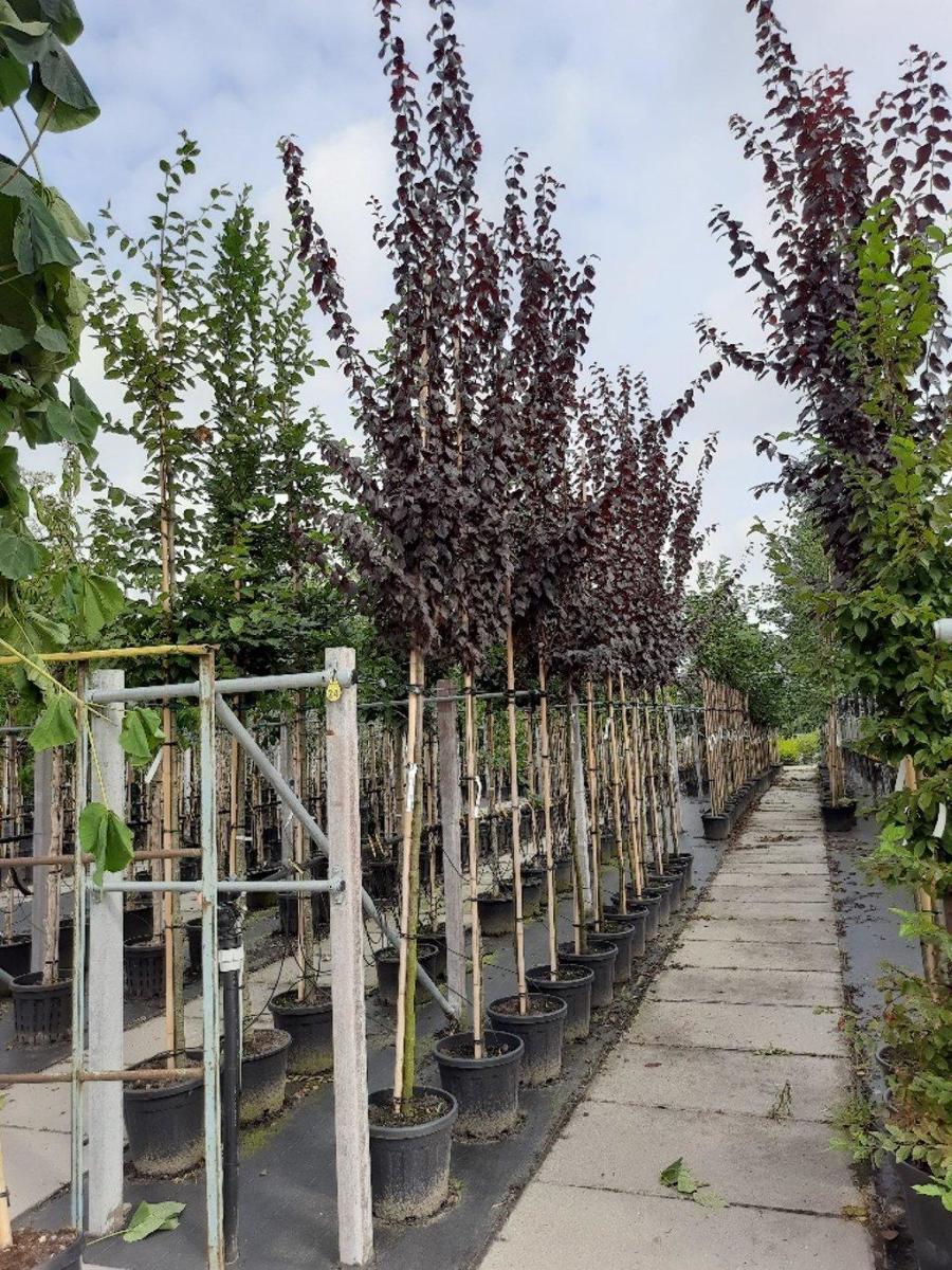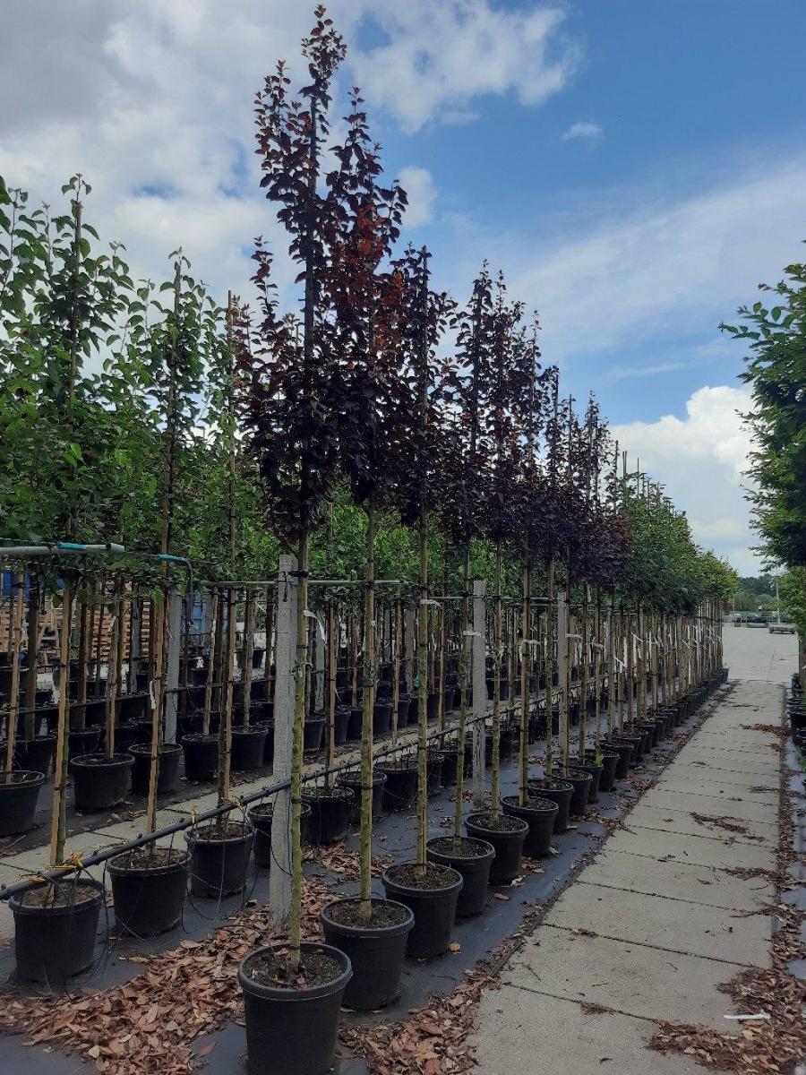Großstrauch oder kleiner Baum. Höhe 4-6 m. Junge Zweige dunkelrot. Rotbraunes Blatt während der ganzen Saison. Kleine, rosa Blüten im März-April. Besonders reichblühend. Sonniger Standort. Fruchtbare Böden.